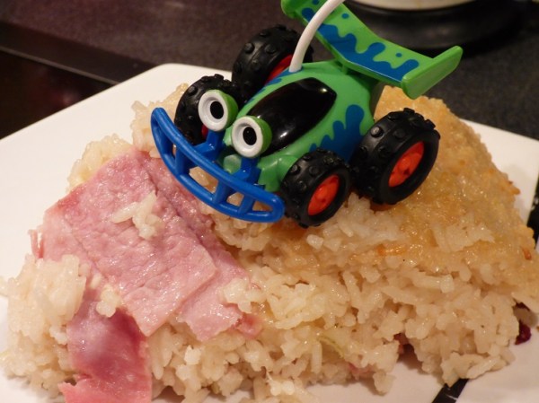 Verser les deux tiers du riz dans un grand plat à four. Étaler dessus la mozza coupée en tranches et le jambon itou. Recouvrir soigneusement du reste de riz, saupoudrer le reste du parmesan et enfourner pour 15 minutes grosso modo, le temps qu’une croûte se forme. On peut comme ici cuire le riz dans une grosse cocotte type le Creuset et la passer directement au four.