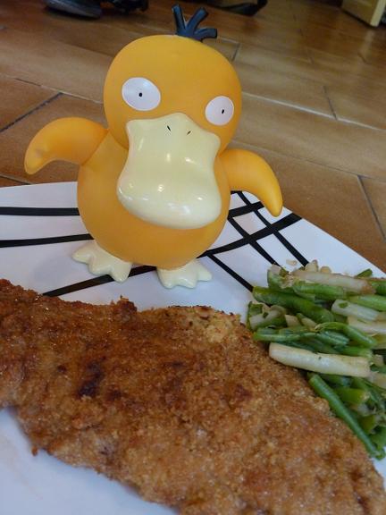 Pendant ce temps, et seulement une fois que tout est prêt, préparer les escalopes (parce qu’une fois qu’on a commencé, on a les mains bien pleines d’œuf et de curly, pas pratique pour verser de l’huile, ou déplacer quoi que ce soit).