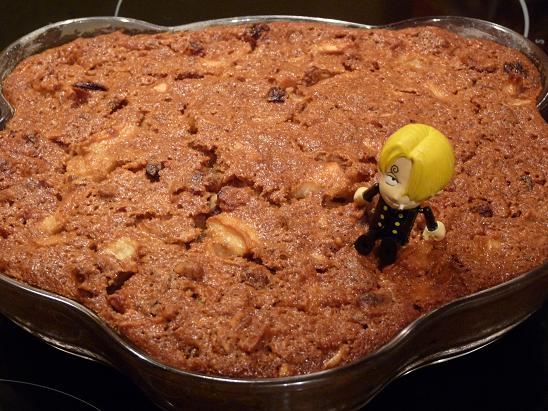 On obtient une sorte de barre Grany moelleuse géante, avec une texture très sympa. La prochaine fois j’essaye en ajoutant de la noix de coco (genre 80 g. de coco râpée, en enlevant 60 g. de farine) ou peut être en mettant des amandes à la place des noix … En attendant, il va déjà falloir finir celui-ci, parce que ça nourrit son homme, mine de rien