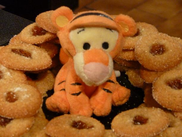 Avec le manche d’une cuillère en bois (ou de tout autre ustensile de même gabarit, comme un crayon à papier… le genre SANS la gomme au bout) trempé au préalable dans le sucre glace, faire des petits trous au milieu des bibilles et y mettre un peu de confiture d’abricots.