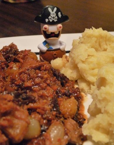 Ça se sert bien chaud, comme tout ragoût qui se respecte, par exemple avec des pommes de terre cuites à l’eau et écrasées à la fourchette avec juste un minuscule chouïa de beurre. (C’est à dire 50 g. pour 500 g. de pommes de terre. J’ai une notion du chouïa qui est toute personnelle).