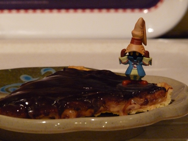 Verser le chocolat bien partout sur la tarte, pour l’étaler plus facilement, car la banane posée sur du caramel est joueuse, et n’aime pas trop qu’on lui joue de la spatule au-dessus de la tête pour étaler du chocolat, donc déééélicatement.