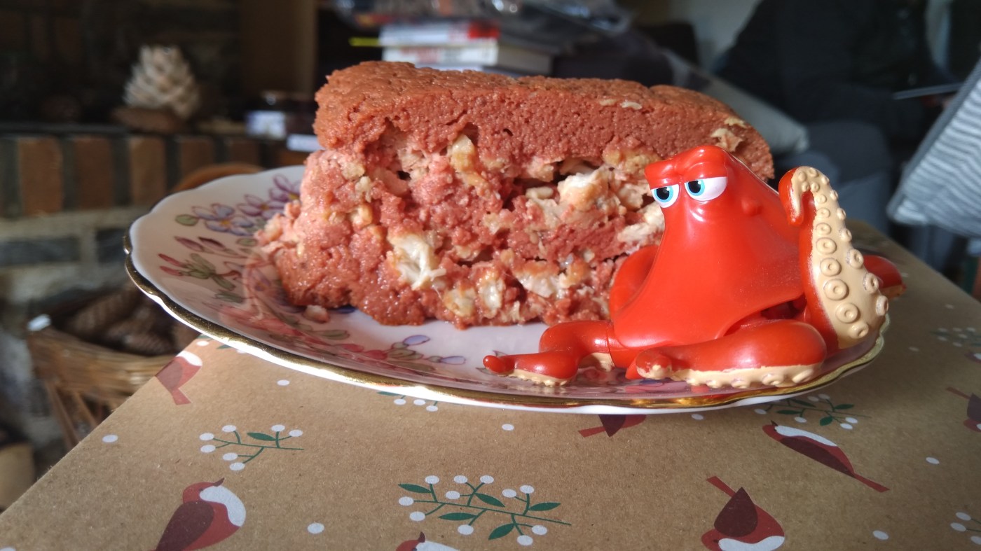 Dans un moule à cake recouvert à l’intérieur de papier d’alu ou de papier cuisson, étaler 1 premier cm de mélange tomaté, puis mettre une couche de lotte, puis tomate, etc et finir par la tomate. Ca fait grosso modo tomate-lotte-tomate-lotte-tomate, ce qui est plus difficile à dire rapidement qu’à faire.