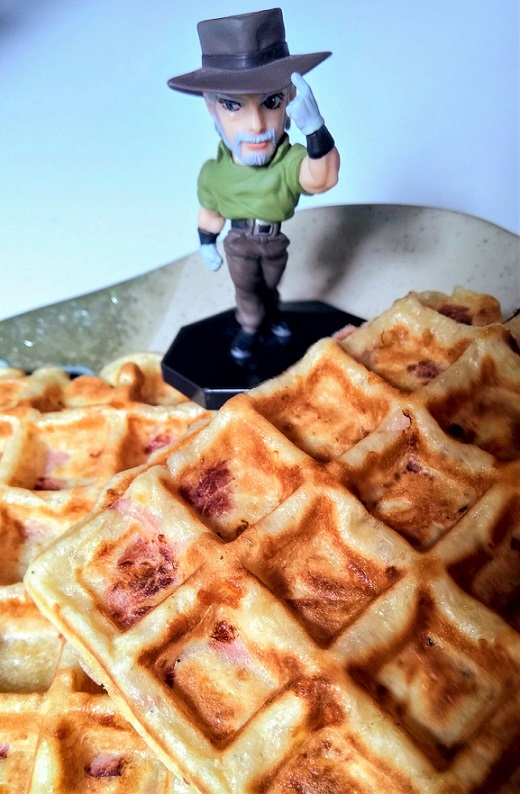 Cette recette, récupérée sur le site de Cuisine Actuelle, est une très bonne base pour les gaufres salées, c’est vite fait bien fait, et ça change un peu. Et pis on peut les manger froides, c’est pratique aussi. Et pis j’ai un nouveau gaufrier, faut bien vérifier qu’il fonctionne correctement (excuse bidon, certes, mais bon).