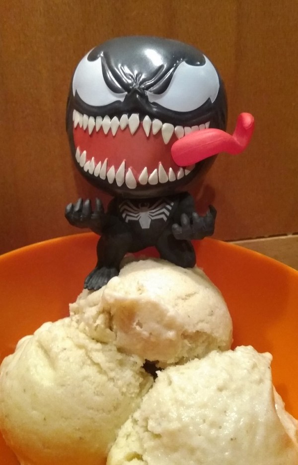 Une fois le mélange bien refroidi, mettre en sorbetière 30 minutes. Perso, elle n’a pas « pris » comme les autres glaces (avec le volume qui augmente et la texture de crème), mais elle s’est très bien comporté à la congélation, donc 1:pas de panique, 2 : ça doit passer sans sorbetière.