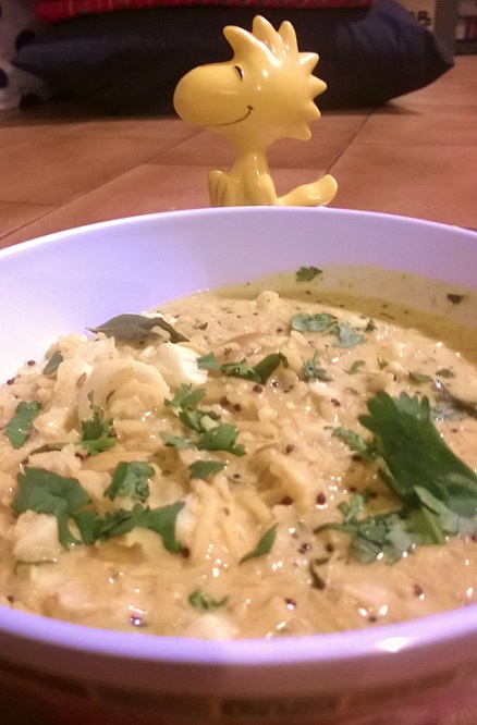 Darling aux fourneaux (mâtin, quel homme), ça donne des recettes différentes, notamment plus complexes au niveau des épices . Cette recette, chopée chez Jamie Oliver, est vraiment facile à faire et ne prend pas trop de temps à faire, hormis les divers émincages et râpage. Sur la photo, ça fait plus plat que soupe, ce qui est normal quand on a de très grandes paluches pour mesurer le riz (j’accuse pas, je constate). Pour faire plus soupe, un verre de riz en dosage, ça sera nickel.