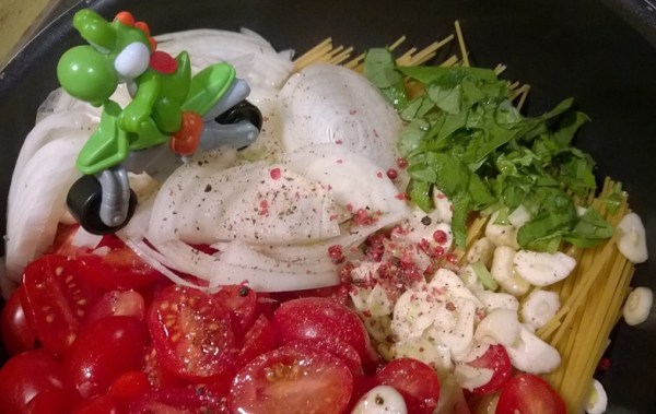 Dans une grande gamelle (ou une sauteuse, si on veut faire classe), mettre les spaghettis, les tomates coupées en 2 ou 4 selon la taille, l’ail, l’oignon et le basilic émincés, les baies écrasées, l’huile d’olive, la Worcester, le bouillon cube, le sel, le poivre puis recouvrir avec l’eau.