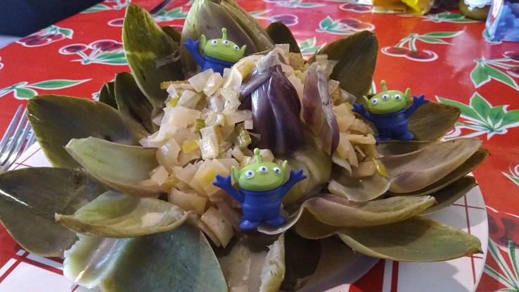 - 4 beaux gros artichauts (on sait, jamais, des fois que vous ayez prévu de prendre les plus malingres et fanés possible à l’étal)