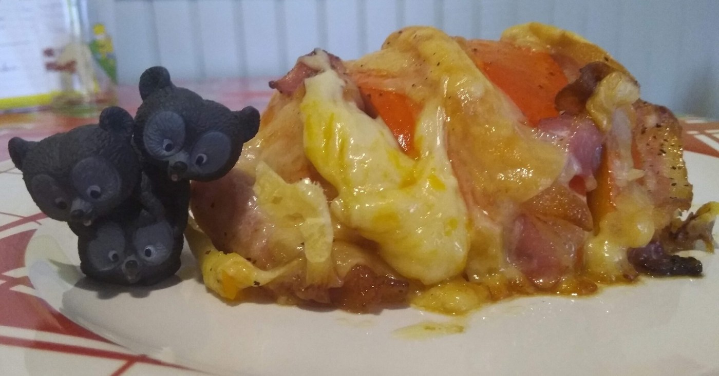 Poser 1/2 tranche de fromage sur 1/2 tranche de poitrine fumée, et rentrer le tout dans le potimarron avec forces grognements et moults râlages. C’est probablement pas beau comme un truc en hérisson de magazine de cuisine. On s’en tamponne.