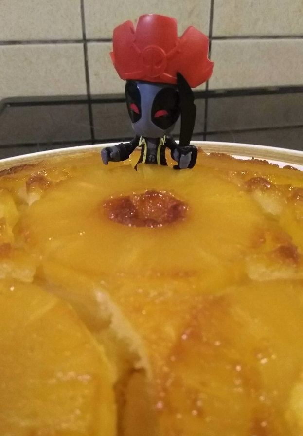 Beurrer un moule à manqué, et répandre une quantité non négligeable de caramel sur le fond du moule. Etaler les tranches d’ananas, classiquement en forme de fleur à papier peint des années 70.