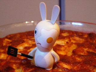 En cuisant, les oeufs forment une couche opaque sur la tarte, ce qui lui donne un aspect assez original. Par contre, inutile d’essayer de couper 8 parts là-dedans sans servir du gloubiboulga. C’est 6 parts, point à la ligne.